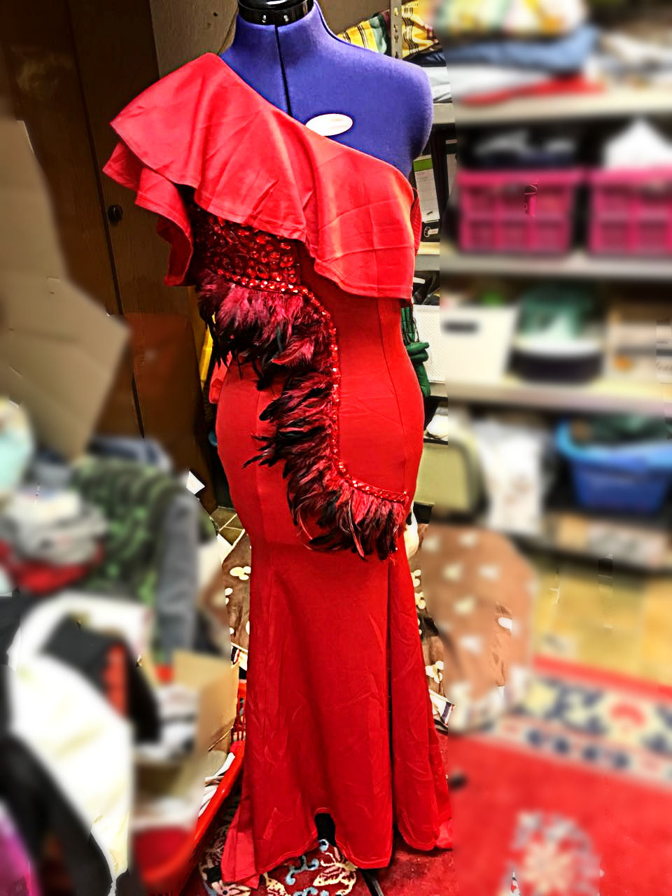 Bei diesem sehr latina-mäßigem Bolero-Shoulder-Dress hatte ich das Glück, dass das Grundkleid frei Haus per Ebay kam. Meine Aufgabe bestand darin, das Kleid der künstlichen Körperform der Protagonistin anzupassen. Ihr müsst wissen das Dragqueen-Körpermaße durchaus äußerst variabel sein können. So werden zum Beispiel die Oberweite und die Hüfte durch Zuhilfenahme verschiedener Silikonpads dem gewünschten Ideal angeglichen. Das heißt für uns Näherinnen zum Abstecken des Kleides erscheint der Kundin zwar mit korsettgeschnürter Taille und gepadeter Hüfte sowie Oberweite, aber leider ohne passendes Make-Up und Perücke.